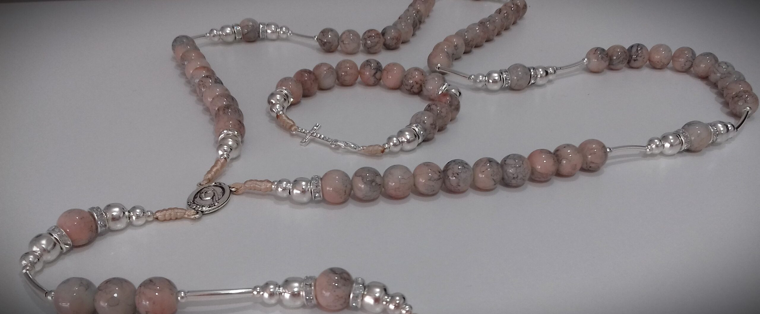 Rosario fatto a mano in pietra di marmo e grani argentati con filo di seta.