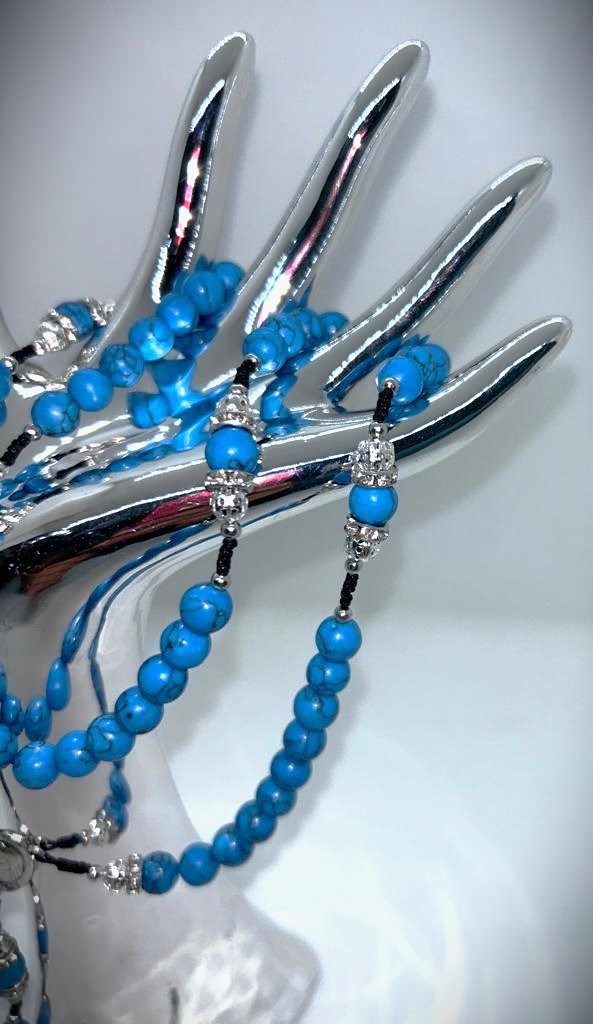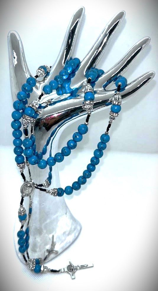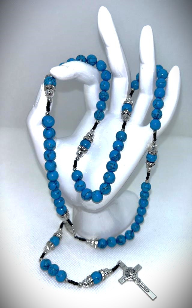 Rosario fatto a mano in pietra di marmo e grani argentati con filo di seta.